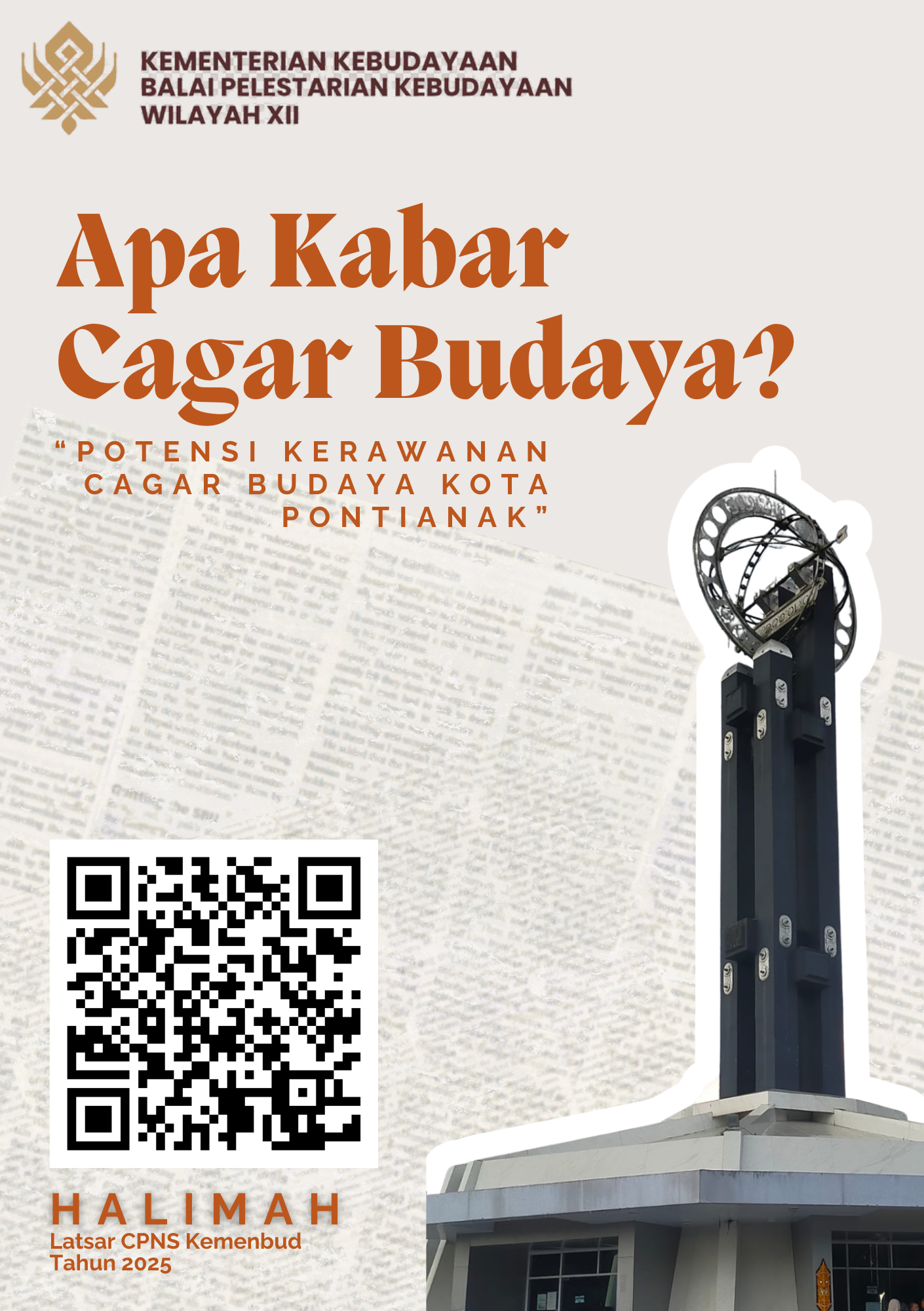 Zine ini merupakan karya hasil Latsar CPNS Kemenbud Tahun 2025 yang berfokus pada potensi kerawanan cagar budaya di Kota Pontianak. Melalui pendekatan deskriptif visual dan berbasis data spasial, karya ini mengidentifikasi berbagai potensi kerawanan cagar budaya akibat faktor alam, manusia, dan kondisi objek itu sendiri. Analisis menunjukkan bahwa sebagian besar situs cagar budaya Pontianak berada pada zona kerawanan sedang hingga tinggi terhadap banjir, kekeringan, dan angin puting beliung. Selain itu, ancaman non-alam seperti vandalisme, pengelolaan yang belum optimal, dan tekanan pembangunan juga memperbesar risiko kerusakan. Zine ini tidak hanya menyajikan hasil pemetaan kerentanan, tetapi juga memberikan rekomendasi dalam upaya menjaga pelestarian cagar budaya. Melalui gaya penyajian popular, komunikatif, dan dekat dengan pembaca muda masa kini, karya ini diharapkan menumbuhkan kesadaran generasi muda akan pentingnya menjaga warisan budaya sebagai identitas dan memori kolektif Kota Pontianak.