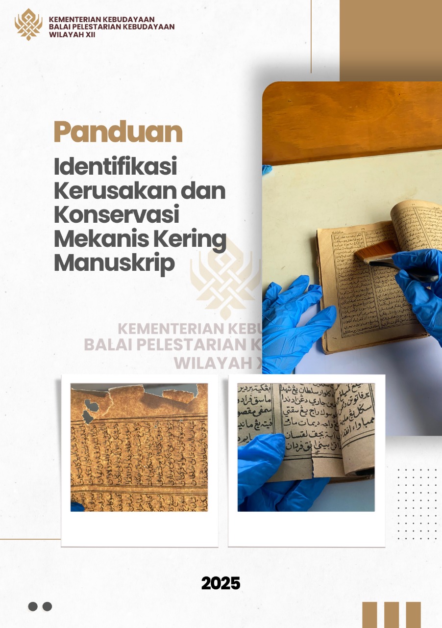 Panduan identifikasi kerusakan dan konservasi mekanis kering manuskrip disusun sebagai upaya untuk melestarikan warisan budaya bangsa berupa naskah kuno yang memiliki nilai sejarah dan pengetahuan yang mendalam. Panduan ini menjelaskan terkait pengetahuan jenis bahan manuskrip, prinsip konservasi dan etika pelestarian, serta agen penyebab penurunan mutu koleksi. Menguraikan secara terstruktur proses identifikasi kerusakan dan metode konservasi mekanis kering yang dapat dilakukan tanpa penggunaan cairan atau bahan kimia. Tahapan identifikasi kondisi manuskrip mencakup persiapan peralatan, dokumentasi makro dan mikro, pengukuran dimensi, serta pencatatan detail kerusakan. Proses konservasi mekanis kering secara sistematis mencakup pembersihan dengan kuas dan penghapus, perbaikan menggunakan filmoplast, serta evaluasi hasil konservasi. Panduan ini juga menekankan pentingnya perawatan pasca-konservasi melalui pengaturan suhu, kelembapan, perlindungan cahaya, dan monitoring secara berkala. Panduan ini diharapkan dapat menjadi referensi atau rujukan bagi pelestari, pengelola koleksi, dan masyarakat untuk menjaga kelestarian manuskrip agar tetap terawat dan dapat diwariskan kepada generasi berikutnya.