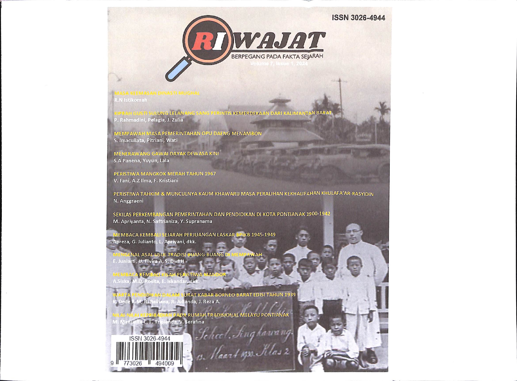 Majalah Riwajat Volume 7, Issue 1, 2024 terdapat beberapa artikel didalamnya yang meliputi Masa Keemasan Dinasti Mughal oleh Rosidah Nur Istikomah; Kiprah Gusti Sulung Lelanang, Sang Perintis Kemerdekaan Dari Kalimantan Barat oleh Putri Rahmadini, dkk; Mempawah Masa Pemerintahan Opu Daeng Menambon oleh Sofie Imacullata, dkk; Menerawang Gawai Dayak Dewasa Kini oleh Santika Andriani Panena, dkk; Peristiwa Mangkok Merah Tahun 1967 oleh Veronika Fani, dkk; Peristiwa Tahkim Dan Munculnya Kaum Khawarij Pada Masa Peralihan Kekhalifahan Khulafa’ar-Rasyidin oleh Noviana Anggraeni; Sekilas Perkembangan Pemerintahan Dan Pendidikan Kota Pontianak 1900-1942 oleh Muhammad Apriyanta, dkk; Membaca Kembali Sejarah Perjuangan Laskar BPIKB 1945-1949 oleh Apreza, dkk; Mengenal Asal Usul Tradisi Buang-Buang di Mempawah oleh Erna Juniarti, dkk; Membaca Kembali Kisah Peristiwa Mandor oleh Ayu Siska, dkk; Warta Pendidikan Dalam Surat Kabar Borneo Barat Edisi Tahun 1939 oleh Kinana Dede R.M, dkk; dan Nilai-Nilai Kepribadian Pada Rumah Tradisional Melayu Pontianak oleh Marbella Manuelta C, dkk.